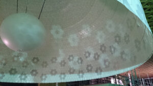 みんなの森 ぎふメディアコスモスのグローブの模様をみんなで作成して、実際に天井にあげられた時
