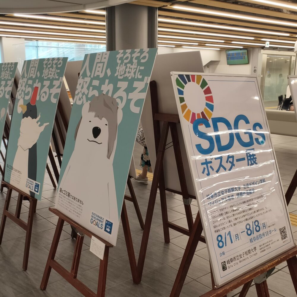 8/1(月)〜8/8(月)の期間中、岐阜市役所 庁舎1階 エントランスホールにおいて、生活デザイン学科 ヴィジュアル専修の学生諸氏が演習授業で制作した「SDGsの啓発を目標とした情報発信ポスター」を展示しています。このポスターは、SDGsに関する理解を深めると同時に、SDGsを自分ごとと捉え、行動する人を増やすことを目標に制作されました。作品をご高覧いただき、改めてSDGsへの関心を高めていただけましたら幸いです。
