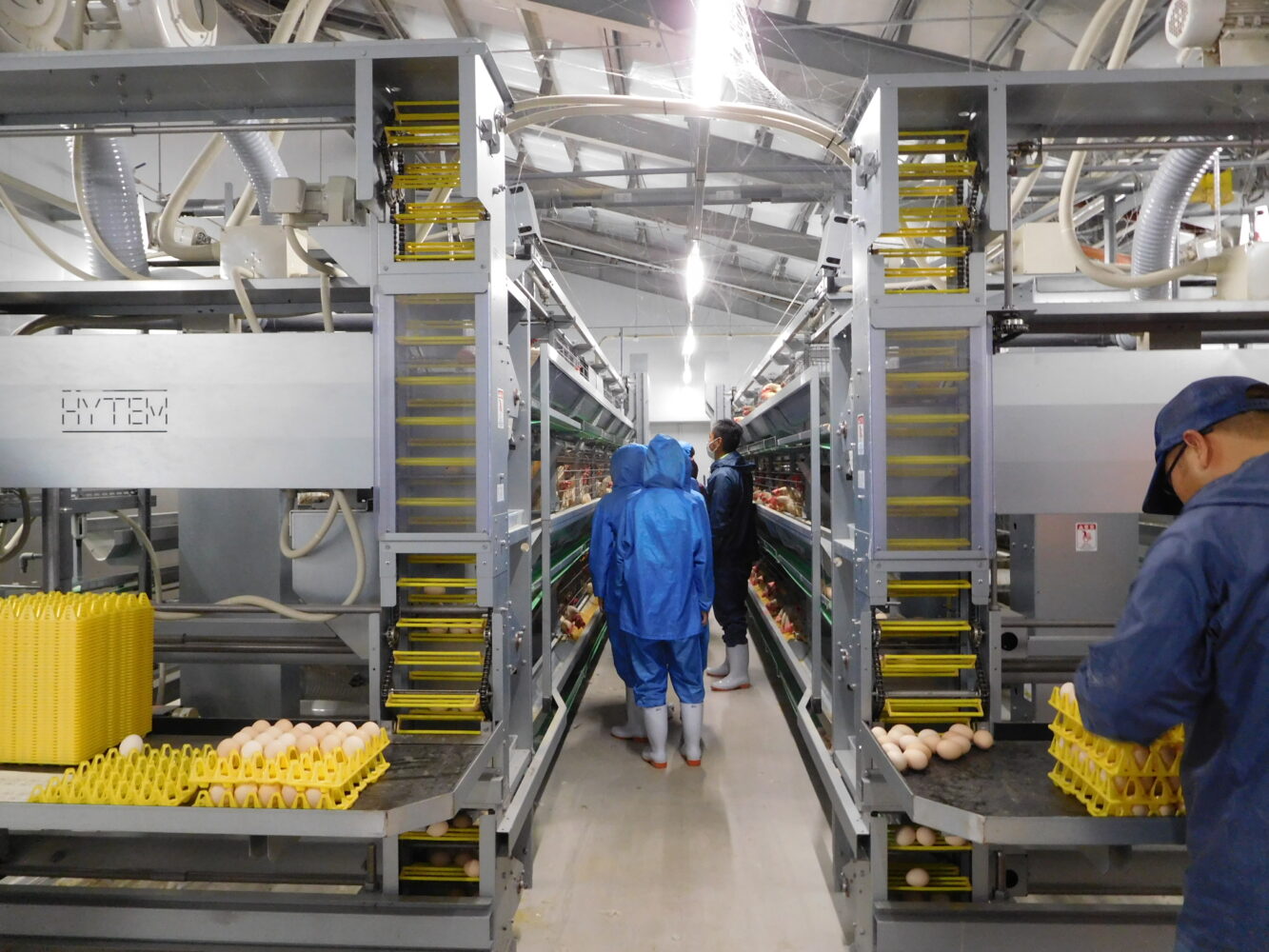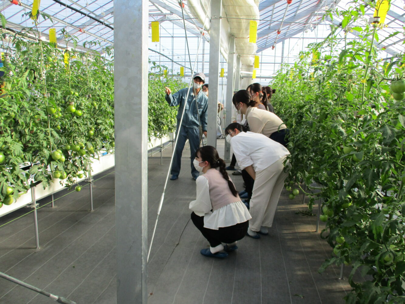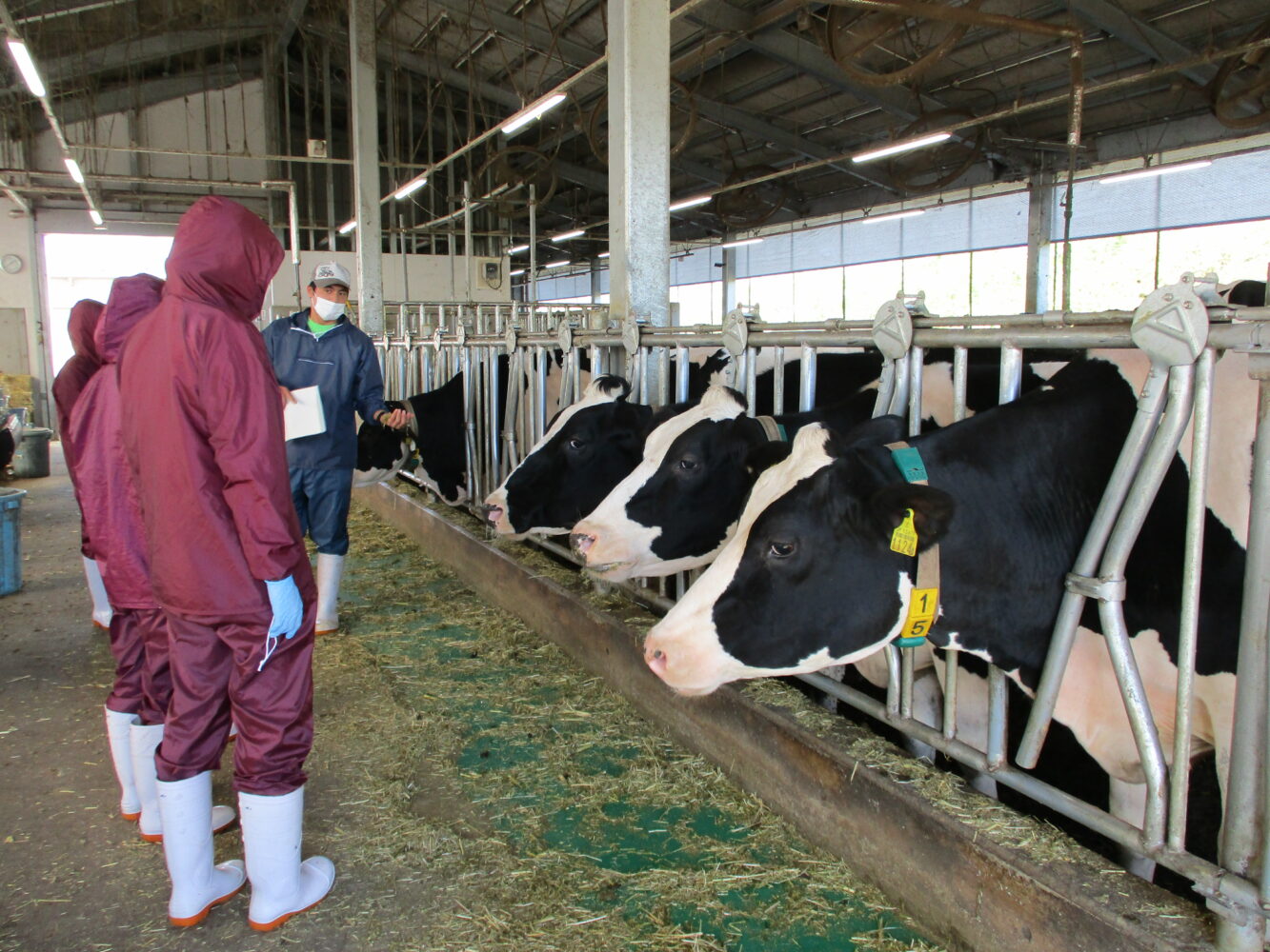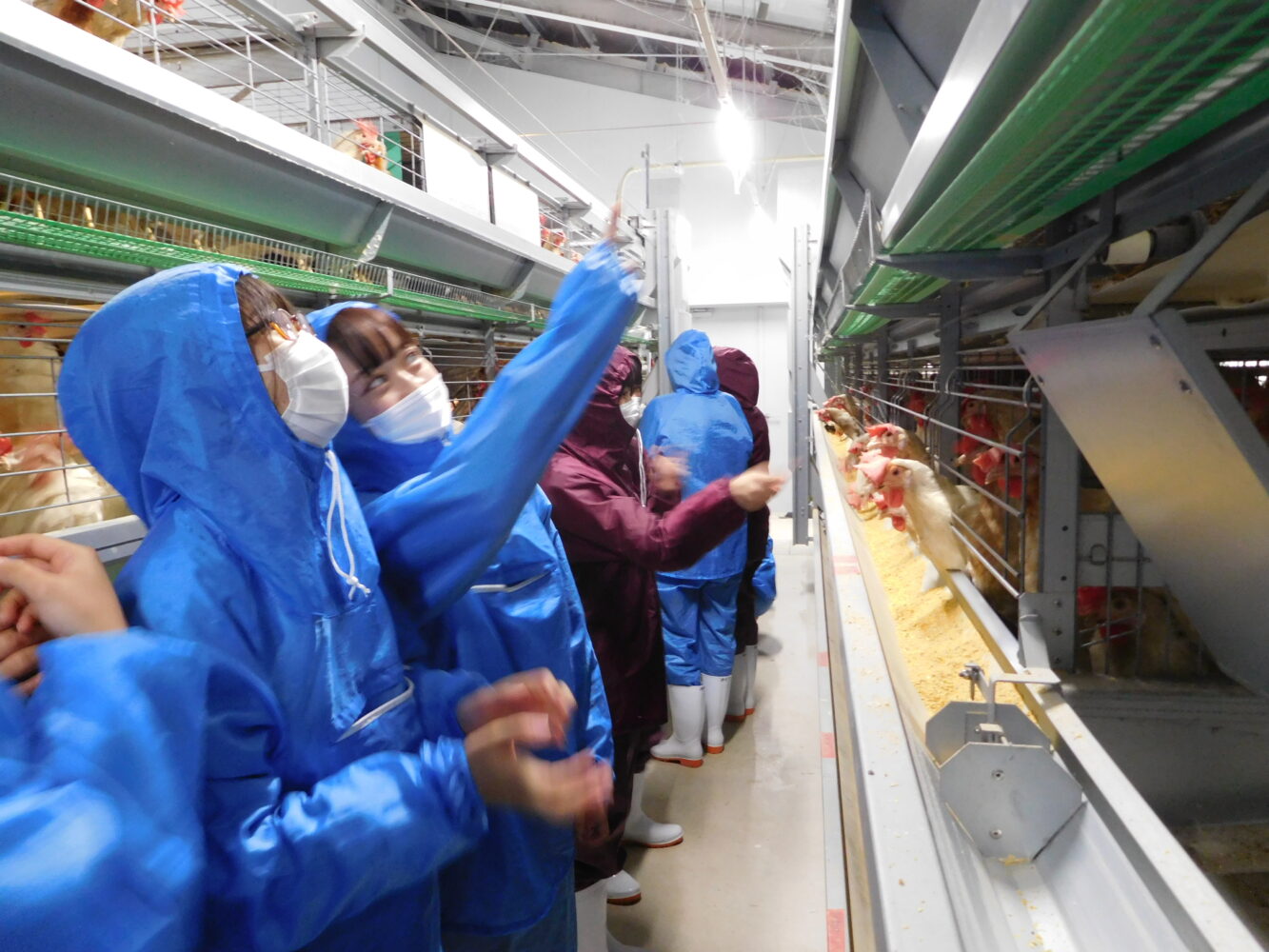 農場の概要説明と講義のあと、牛舎と鶏舎に入り、牛や鶏の飼育方法と衛生管理を学びました。農場の鶏卵を使って反転卵にも挑戦しました。また、トマト栽培を管理された温室で行うスマート農業の説明があり、とても有意義な時間を過ごすことができました。