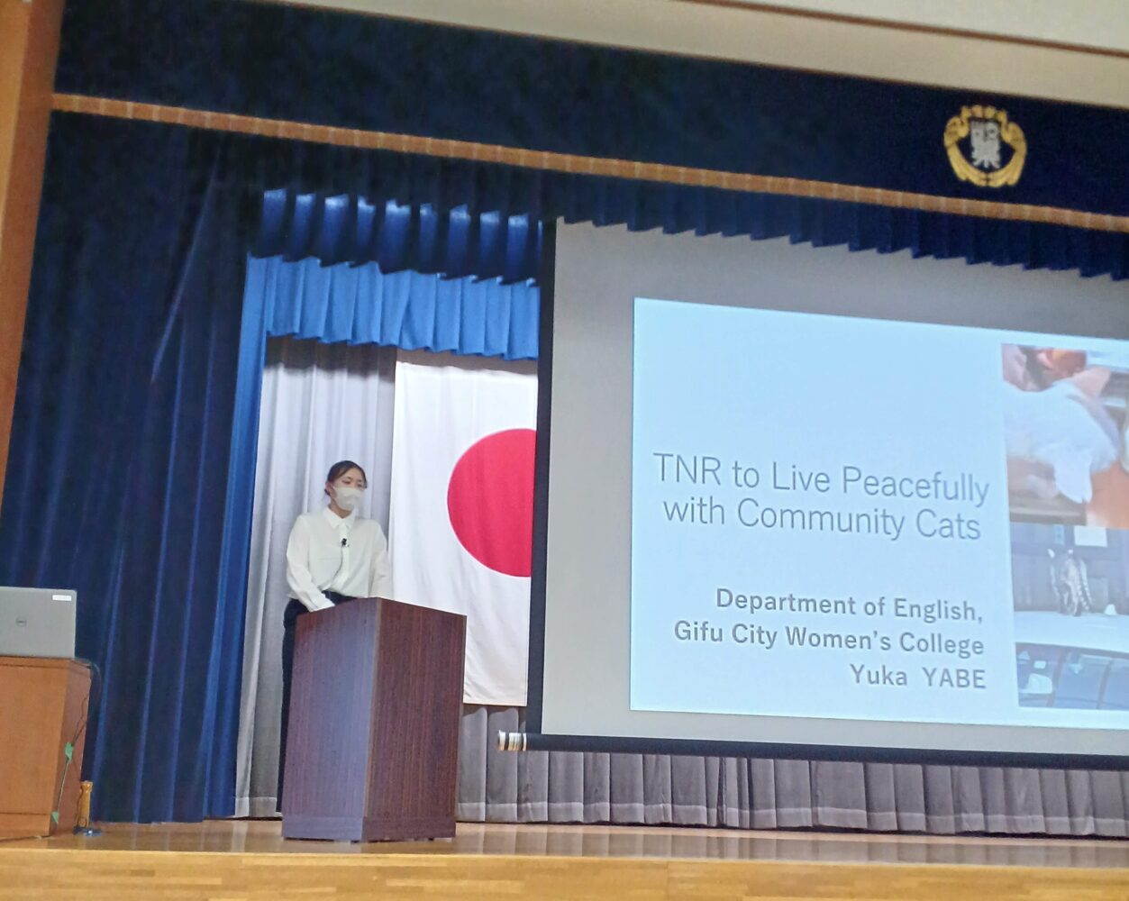 令和4年12月21日、岐阜薬科大学三田洞キャンパスにおいて、本学と岐阜薬科大学との共催で英語スピーチコンテストが実施されました。同コンテストには本学から3名が参加し、食物栄養学科の松尾英代さんが3位入賞となりました。3名とも、薬学部の大学院生や5年生なども参加するなか、堂々と自身の考えを披露してくれました。