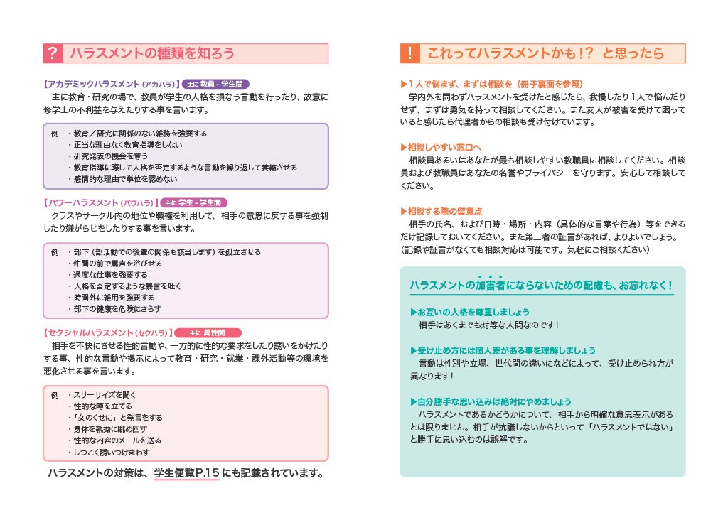 「これってハラスメントかも?」「友人がハラスメント被害にあっている?」と思ったとき教職員へ相談してください。